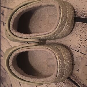 These stylish crocs feature a glittery silver design, perfect for adding sparkle to any outfit. Comfortable and easy to wear, they are ideal for everyday adventures.