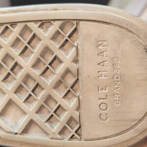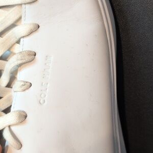 Experience timeless style with these Cole Haan white leather sneakers, featuring a sleek low-top design and a clean, monochromatic look. Crafted with an all-white leather upper and durable rubber soles, these sneakers offer both comfort and versatility for everyday wear. The minimalist silhouette and rounded toe cap make them a perfect addition to any casual wardrobe.