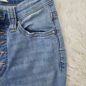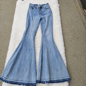 These Free People jeans feature a classic blue hue with a stylish flare and wide leg design, offering a timeless and versatile look. The denim is crafted with a medium-light wash, providing a casual yet chic appearance. Perfect for adding a touch of retro flair to any outfit. soft and lightweight.