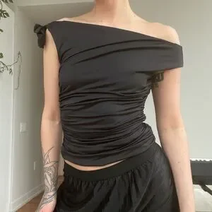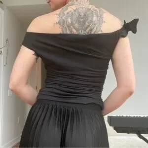 Chic off-shoulder top in sleek spandex black fabric. It ties on one shoulder in a cute little bow. Nice cold shoulder top. It’s in perfect condition, no call outs. Such stunning look for a night out! Pair with jeans for a casual summer look or with business trousers for an office outing. So feminine and girly. Nice staple piece!