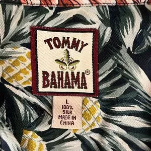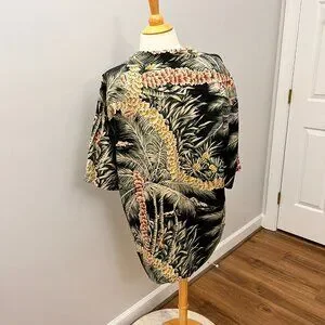 Tommy Bahama shirt in a killer Hawaiian design. This is an eye catching piece for your next summer soirée. It is 100% brushed silk so it is very light and looks amazing. the colors muted so it's not over the top. Coconut Buttons