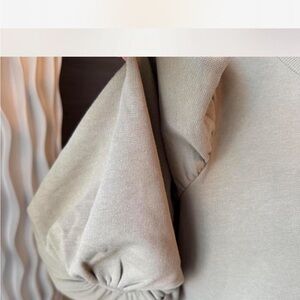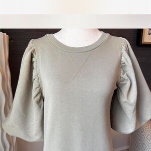 This tan mini dress by Rebecca Minkoff features a chic sheath silhouette with 3/4 length puff sleeves and a classic crew neck. Ideal for casual or work settings, its structured design offers a modern yet timeless appeal. Mannequin is size 2-4.