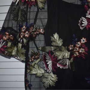 This new with tags Ruff Hewn short sleeve blouse has all kinds of great details. Size medium. The floral embroidery. It's sheer. The ruffle detail on the sleeves. What's not to like? Multicolor floral (burgundy, orange, tan, green, silvery white, blue) design on black background. Spaghetti strap black tank underneath sheer overlay.