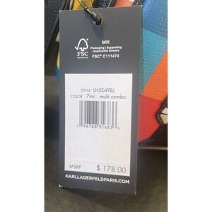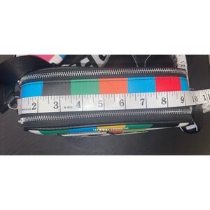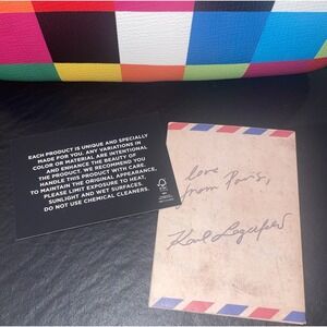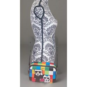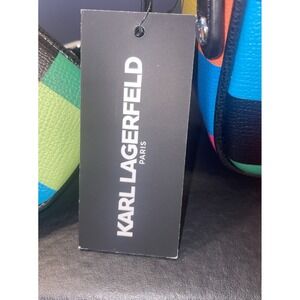 Aprroximate size 9 inches by 6 inches. (Small mark on head of karl shown in pictures not noticeable)The Karl Lagerfeld Paris Maybelle Multicolor Crossbody Camera Bag is a medium-sized handbag made of faux leather with silver hardware. It features a colorful exterior with a colorblock pattern, complemented by a black fabric lining. The bag has a zip closure and includes accessories like a detachable strap, brand card, coin purse, and bag charm, adding to its charm as a designer piece from the Karl Lagerfeld Paris product line. Perfect for women looking for a stylish crossbody bag to complement their outfit, this handbag is both fashionable and practical.