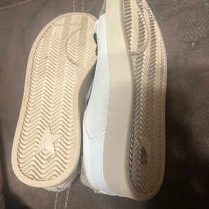 These sneakers boast a stylish two-tone design with a predominantly white body and tan accents. The comfortable, classic silhouette features a flat sole, making them perfect for everyday wear. The clean and modern look is enhanced by the sleek design and quality materials.