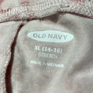These are pre-owned Old Navy leggings in size XL (14-16) with a stretch fit. They are made in Vietnam and feature a pink and red floral print. The leggings are in good condition with no visible tears or holes. The fabric is soft and comfortable. The leggings have a high waist and a slim fit. The inseam is approximately 29 inches. The leggings are made of a blend of cotton and spandex.