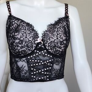 Experience elegance with this Victoria's Secret black lace bra, featuring intricate floral patterns and supportive underwire design. The scalloped lace edges and playful polka dot straps add a charming touch to this classic piece of lingerie.