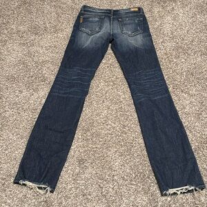 Paige Premium Denim jeans in size 26 featuring a classic straight leg cut and soft, lived-in distressing throughout. Medium blue wash with natural fading and whiskering. Signature Paige quality with a flattering mid-rise fit. Super comfortable with just the right amount of stretch.