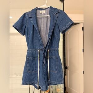 2024 season Ref denim romper with short sleeves. Features a drawstring waist and front pockets.