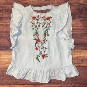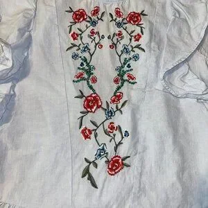 Add a touch of bohemian charm to your wardrobe with this beautiful Zara blouse! This top features intricate floral embroidery in vibrant red, green, and blue tones, creating a stunning focal point on the front.