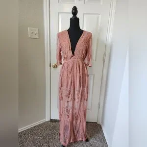 This elegant lace dress features a deep V-neck and intricate detailing, perfect for any special occasion. The blush pink hue adds a touch of sophistication and charm.
