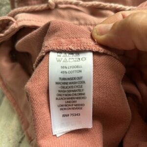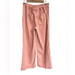 Joie 55% Lyocell /45% cotton wide leg high waisted pull on pants with unique drawstring capability. Thick quality fabric with comfort and style. Deep front cargo style pockets. Elastic waistband in back. Relaxed fit. Soft rose to salmon color