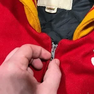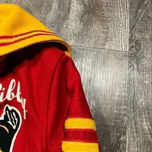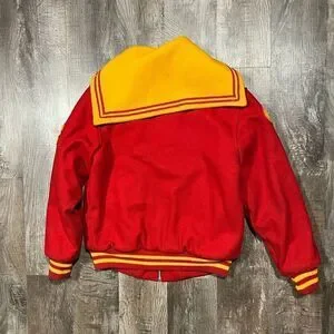 Bold red jacket with yellow accents. Features embroidered details. Classic zip-up style.