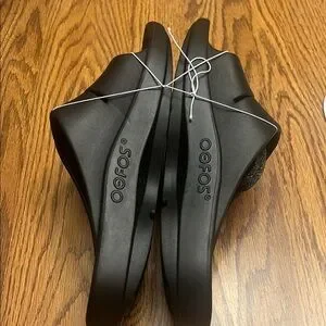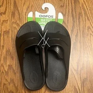 Comfortable black slide sandals by OOFOS. Perfect for casual wear.