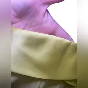 Note: There are minor dust stains on the fold-over neckline and skirt front from storage. A professional dry cleaning is recommended to lift these easily.