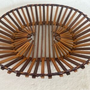Constructed from durable and lightweight wood, this basket embodies the timeless appeal of natural materials. The varying shades of the wood add warmth and texture, making it a complementary piece for diverse decor styles, including farmhouse, bohemian, or minimalist aesthetics. Great condition with some slight splintering due to age. Please review photos.