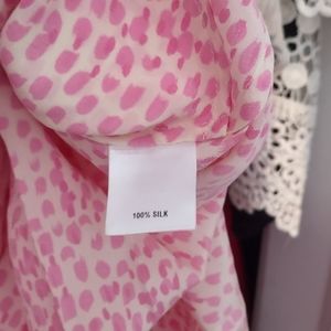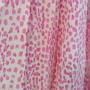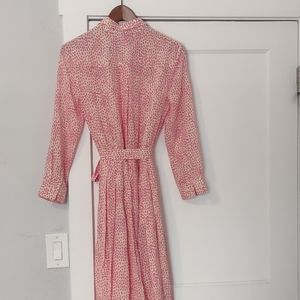 Chic pink midi dress by Anthropologie x Tucker NYC. Features a watercolor pink dot pattern, sleek zipper front, and tie belt waist. Tea length and flowy. Very Kate Middleton!