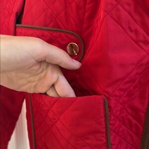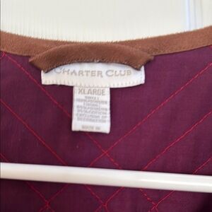 This vibrant red utility jacket by Charter Club showcases a structured silhouette and a collarless design. Its full-length front zipper and long sleeves make it a versatile addition to any wardrobe, perfect for casual to semi-formal occasions.