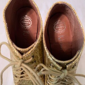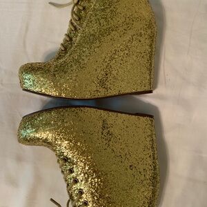 Sz. 8.5 Jeffrey Campbell “99 Tie” Gold Glitter Wedge Bootie