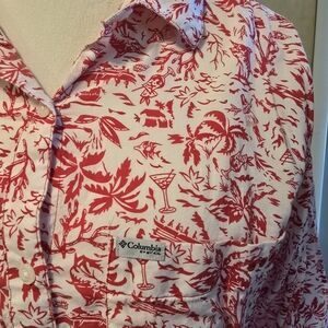 Stylish Columbia blouse. Pink/Red floral/tahitian pattern on white fabric. Button-up front. Perfect for casual wear.