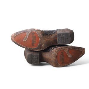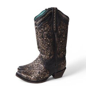 Elegant black boots with intricate gold embroidery. Features studded details. Perfect for a stylish look.