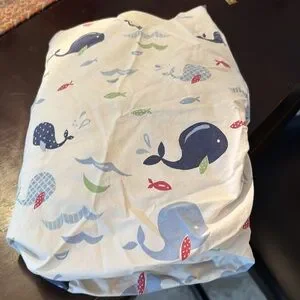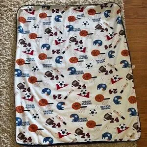 Cozy baby blanket 30 x 34 with sports theme. Features basketballs, footballs, and more. Perfect for little sports fans. (1) crib sheet with whales and (1) crib sheet with anchors.