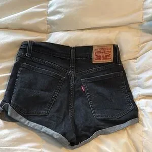 These Levi's black jean shorts feature a trendy frayed hem and a classic cut-off style, perfect for a casual and relaxed look. Made from high-quality denim, they offer a comfortable fit and a stylish appearance. Ideal for warm weather outings, these shorts are a versatile addition to any wardrobe.