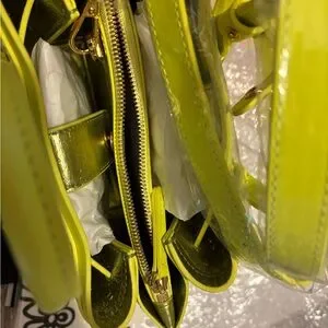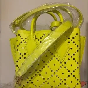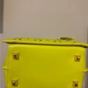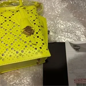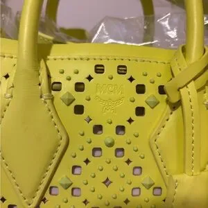 This vibrant yellow mini bag from MCM features a striking geometric perforated design, making it a standout accessory. Crafted with a structured silhouette and top handles, it combines style and functionality effortlessly. Perfect for adding a bold touch to any ensemble.