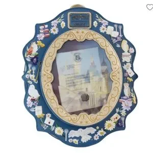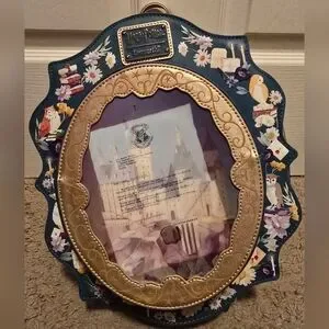 The exclusive Limited Edition Loungefly Harry Potter Hogwarts School of Witchcraft and Wizardry Cameo Mini Backpack. Backpack has adjustable shoulder straps, side pockets, and gold-colored hardware. Additional features include applique, printed, metalic, and debossed details. Mini backpack also features a figural front- zipped pocket, shaped like a cameo. Lenticular features in the middle of the cameo display two images: the invitation letter that Harry Potter receives and Hogwarts.