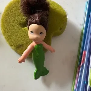 These dolls have seen a lot of wear and tear, hence the price. The pink one has hair loss and some pieces cut a bit shorter (1.5” long, maybe/ see photos). I recently de-tangled with Dawn, and hot water, but alas, 45* years of water and play has been tough in a gal. One of the original beat-up lily pads included. There is paint loss from normal childhood tub time use.