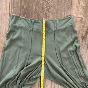 Flowy culotte pants in a great soft olive green shade. High rise waist. Easy pull on style. No pockets. Perfect for casual outings.