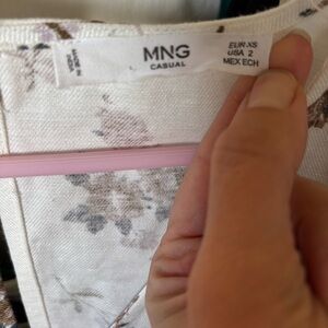 Flowy, bohemian white dress from Mango, with vintage-like flower pattern and bold, charming buttons up the front. Fits loosely, but includes matching waist belt to adjust fit to your liking.