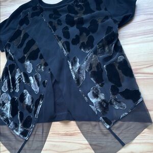 This chic black shirt features trendy sheer accents on the sides, perfect for adding a touch of style to any outfit. Comfortable and fashionable, it's a great choice for everyday wear.