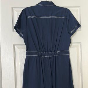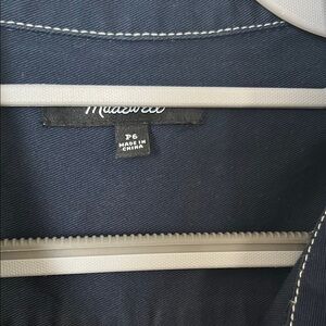 Stylish navy jumpsuit by Madewell. Features contrast stitching and button details. Short sleeves and wide legs for a modern look.