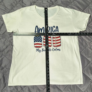This women's Brisco Brands T-shirt is white and features a graphic with the word "America" above three mason jars filled with American flag patterns and the phrase "My Favorite Colors" below. NWT. Size 2X.