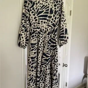This striking sundress from Anthropologie features a bold navy and white abstract print, perfect for casual or work settings. The dress boasts a V-neckline and elegant bishop sleeves, offering a sophisticated yet relaxed silhouette. Its lightweight fabric ensures a comfortable fit, making it an ideal choice for any occasion. Only worn once.