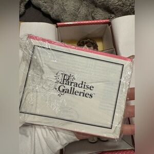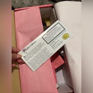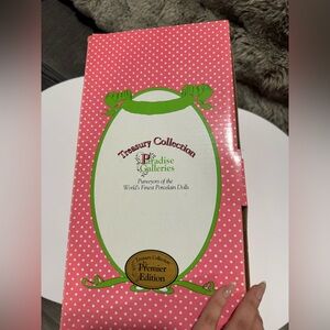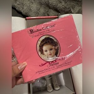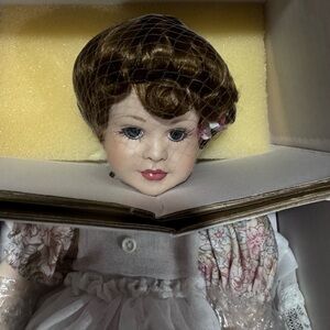 Charming porcelain doll in a floral dress with lace details. Perfect for collectors.