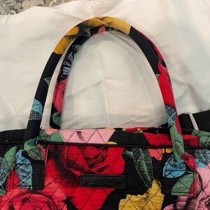 This Vera Bradley Havana Rose quilted weekender bag showcases a striking floral pattern on a black background, highlighted by bold red roses. Ideal for travel, it combines elegance with practicality, making it a standout accessory for any journey. Bag has double handle or the long padded strap for carrying on the shoulder. There are two pockets inside and a long outside pocket. This bag also features a trolley sleeve.