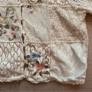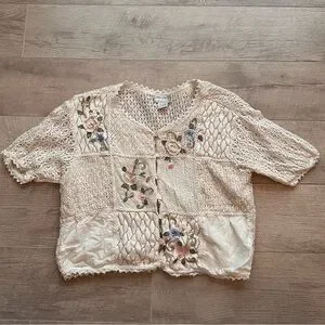 Vintage 90s embroidered crocheted quilt patchwork button down short sleeve top!