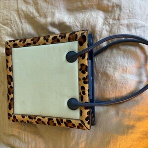 Fun and stylish vintage tote bag in perfect condition. Features leopard print border and blue leather handles. Unique design with a chic illustration on the front.