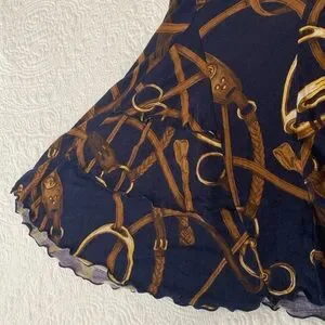 This elegant Ralph Lauren skirt showcases a stunning blue and gold palette in a bubble style with tiered layers. Designed for cocktail occasions, its knee-length cut and A-line silhouette offer a sophisticated and chic look. The skirt's flowing movement and luxurious fabric make it a standout piece for any night.