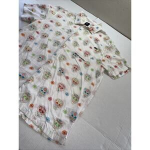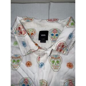 The Vans shirt is a men's size large button-up shirt featuring a graphic print of multicolor skulls in a dia de los muertos theme. Made of cotton with a woven fabric type, this regular fit shirt has short sleeves, a collared neckline, and a spread collar style. The white base color with the intricate skull design makes it a stylish choice for casual wear, perfect for skater and Vans fans looking to add a touch of edgy flair to their wardrobe.