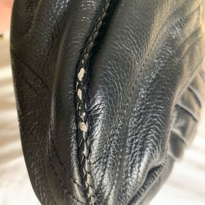 Elegant black leather satchel. Features braided handles and textured design. Perfect for any occasion.