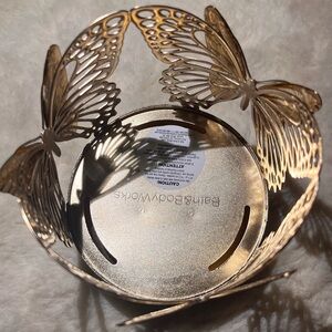 This exquisite candle holder from Bath & Body Works features a stunning butterfly accent in a metallic gold finish. The intricate wing detailing creates a captivating three-dimensional effect, perfect for casting enchanting shadows when lit. NOTE: in used condition, see pictures for flaws.
