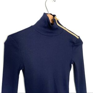 Navy blue. Ribbed. Turtleneck with functional gold zipper that can be worn open or closed. Last photo shows a tiny hole on the front. Size XS. 12.5” armpit to armpit. 22” length.