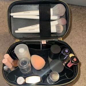 Elegant black travel makeup case with gold accents. Features a sturdy handle and secure zipper closure. Just bought and used a handful of times. Will come with original box, and duster bag. Authentic.