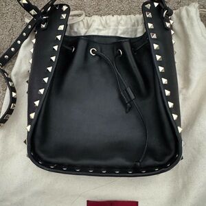 The Valentino Black Studded Crossbody Bag is a sophisticated accessory that combines elegance with a touch of edge. Crafted from premium black leather, it features distinctive silver studded embellishments that add a bold statement to its sleek design. Perfect for any occasion, this bag offers both style and functionality with its structured yet slightly slouchy silhouette.