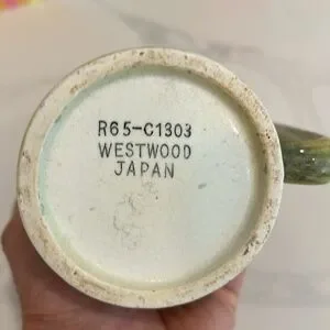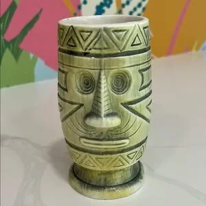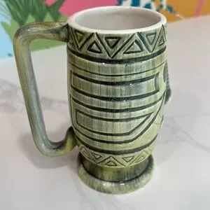 Unique ceramic tiki mug with tribal face design. Features a blend of green and yellow colors. Vintage Westwood Japan R65-C1303