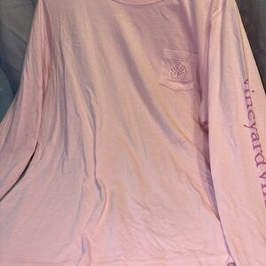 Light pink Vineyard Vines tee with front pocket. Features iconic whale logo.