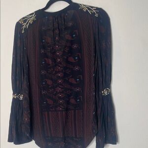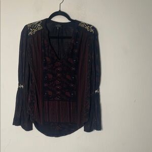 This elegant blouse from Lucky Brand features a striking black and red color palette with intricate embellishments and pleated details. The 3/4 sleeves add a touch of sophistication, making it perfect for both casual and formal occasions.